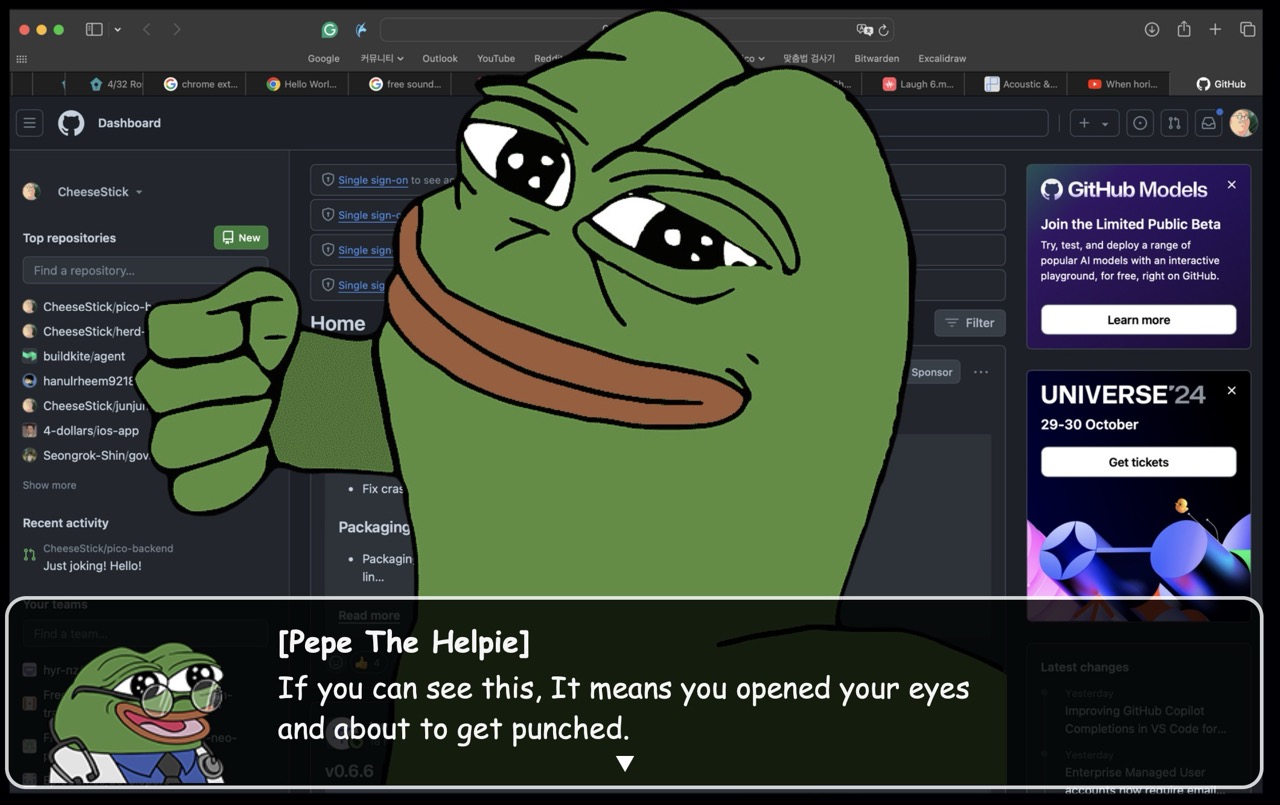 Repo: https://github.com/dawinkweon/terrible-pepe Pepe The Helpie™ Did you ever have to finish your assignment tonight but have trouble focusing? Do your eyes get easily tired from all the work? Pepe…