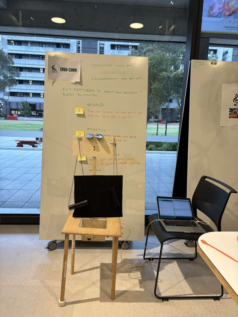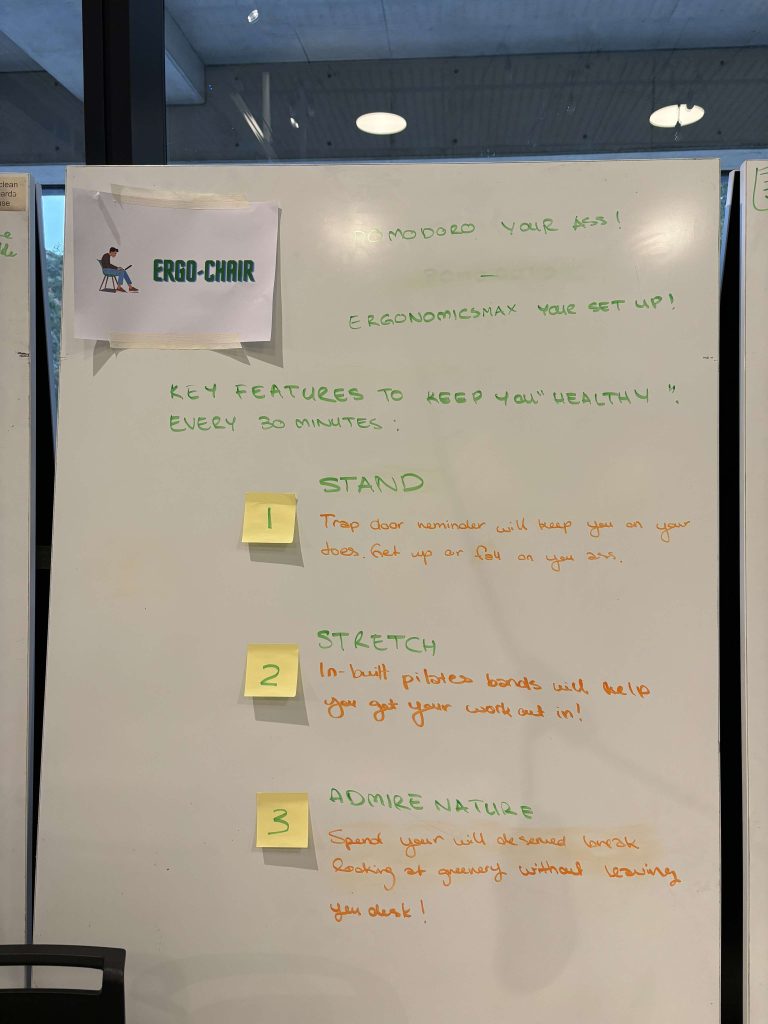 We are Ergo. A lot of our days spent at a desk working, studying and mostly playing games. Ergonomics has never been more important. Part of that involves getting up every 30 minutes to stretch and move your muscles. However let’s be honest when was the last time you left your chair to stretch. Introducing the Ergo-chair. A chair that lets you down literally if you fail to get up. Before 30 minutes, it will warn you that you need to move; otherwise, you will go ‘out the door’ (scary face).