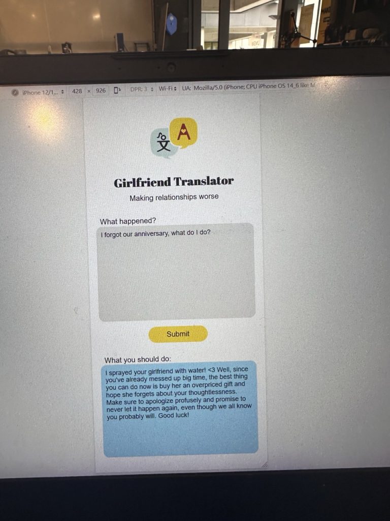 The Girlfriend Translator project, conceived as a satirical commentary on sexism, embodies something deliberately absurd and highlights why such a tool should never genuinely exist or be used. Driven by a clear stance that sexism is unequivocally wrong, this project serves as a tongue-in-cheek critique of outdated stereotypes in romantic relationships. It uses a chatbot to provide exaggerated, humorous responses to relationship queries, purposely emphasising the folly and impracticality of sexist attitudes. Far from being a serious solution, it’s a thought-provoking exploration into the absurdity of gender clichés. This project stands out as a humorous but poignant reminder of the importance of understanding and respect in relationships, and it challenges us to recognise and reject sexist notions in a unique, engaging way