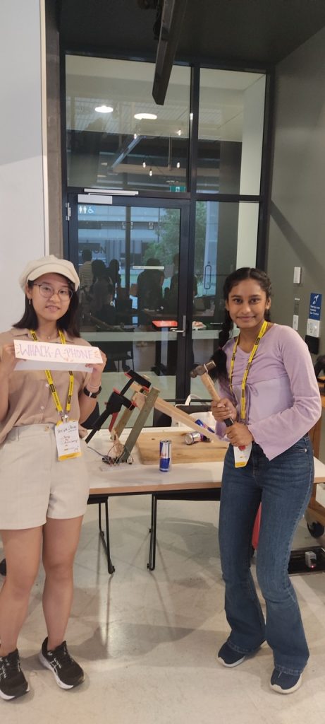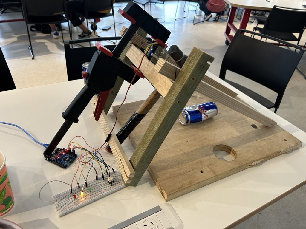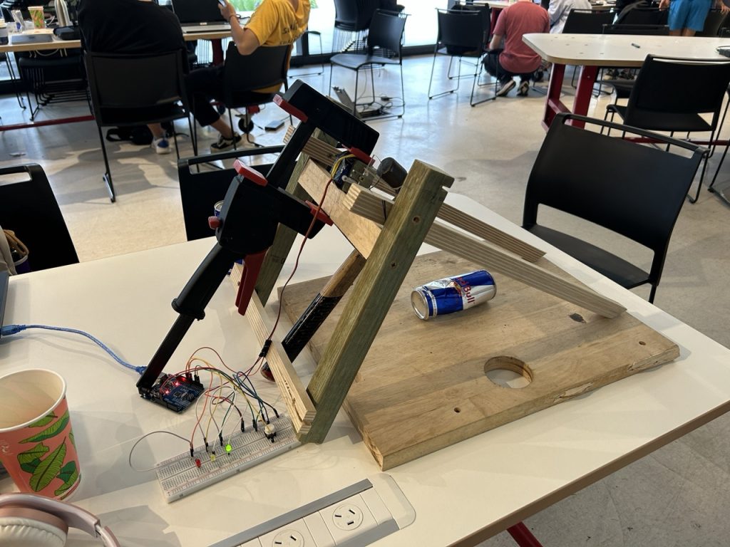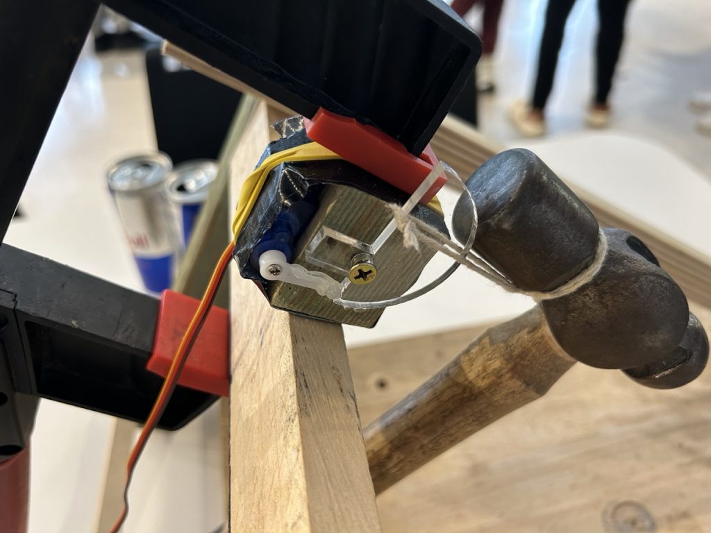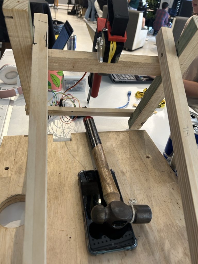 We’ve actually had time to make two different projects, both of which revolve around violence (because violence is clearly the answer). Our first and main project is a mechanism that releases a hammer which smashes your phone if you spend more than 5 minutes on your phone. The inspiration came from the pomodoro techniques where 5 minute breaks are never enough and we often go on social media overtime. Our motto is “ruining phones, saving lives”, because the user has to choose between Tiktok and your phone. So parents and teachers, this is a perfect Christmas Gift for your child.
